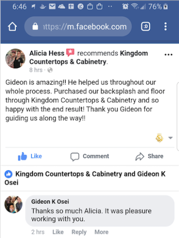 "Here at Hillside Country homes we have been blessed to work with ‘the King’ (Gideon) for the last 14 years. Unparalleled customer service, work ethic, enthusiasm, follow up, and follow through. He's really helped make our company a success. No matter what our customers throw his way, Gideon is able to solve it with a smile on his face. We are excited to partner with Kingdom Countertops & Cabinetry to adorn our customer’s custom homes."